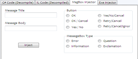 If the programmer places the entire form controls to implement aforesaid design prototype, then it will transpire in this final injector tool form. The following image belongs to message box injector: