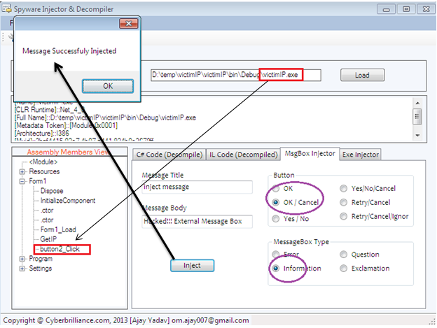 The functionality of external message box and spyware injection into a binary in the software is quite a long and exhaustive process. We shall have to use bizarre classes and methods in order to place the external MSIL code into an existing binary.