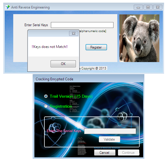 The victim file is typically an application that requires serial keys to proceed. Therefore, open the new version of this file and enter some value. Obviously, the wrong key message shows, and the inject spyware executable also activates and displays as follows: