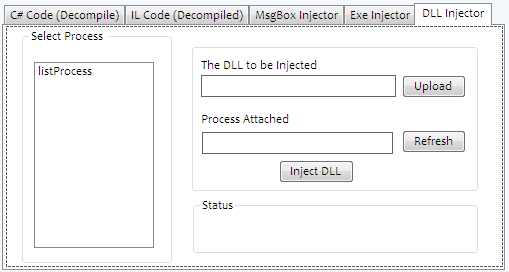 The Listbox control basically enumerates all the running machine processes in order to ease the selection of attaching processes (victim) during DLL injection. The first text box gathers the inject DLL full path via the upload button, and the second textbox displays the selected process from the list box. The Refresh button refreshes the list box in case some service is newly started or terminated. Finally the Inject DLL button injects the DLL into the selected process. Once all the aforesaid form control is placed and arranged in tabcontrol, the design looks something like: