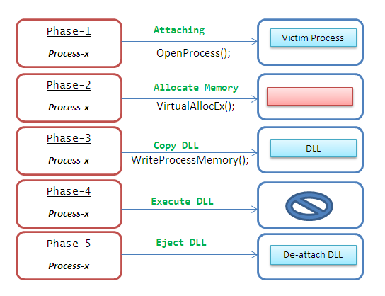 A DLL is typically a Dynamically Linked Library of executable code, referred to as API, which reduces the hassle of repeatedly reproducing common functions. Such API gives an impression of code reusability and can be utilized multiple times in diverse scenarios. The third party program only references the external function from the DLL, and it is loaded into memory and available for manipulation. DLL injection is a process of inserting external code into an existing running process of a machine, in which a piece of malevolent code is triggered-on automatically, without authority or the user's awareness. The code we usually insert is in the form of a dynamic link library (DLL) during this manipulation, since DLLs are meant to be loaded as needed at run time. DLL is very similar to .exe programs, as it has leverage with custom programming logic in form methods, which are called into another application by referencing it. But it can be differentiated by a single characteristic, which is that there is none of the entry-points in a DLL like an .exe file.