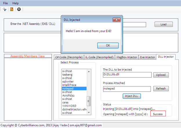 Open the Spyware Injector & Decompiler software after compiling it successfully and go to DLL injection tab. Here, we find all the running machine processes in the List box control. The moment we select anyone, for example notepad, is placed in the corresponding Process textbox and becomes the victim process. Finally, after hitting the Inject DLL button, DLLlib.dll is injected in the Notepad process as follows: