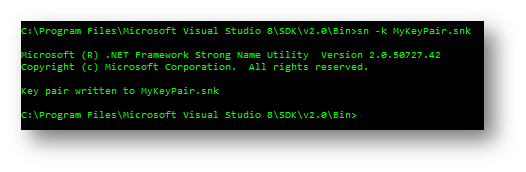 The first step in strong name signing is generating a key pair. The "sn.exe" tool is located in "C:Program FilesMicrosoft Visual Studio 8SDKv2.0Bin" and is a command line based tool, so start Microsoft CMD and use this command to generate a new key pair: