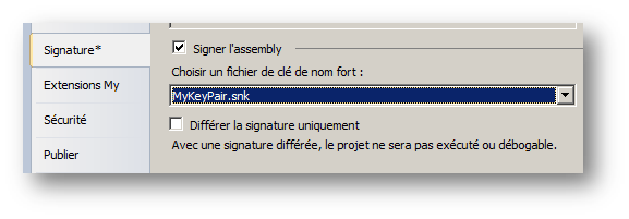 Well, now by using MyKeyPair.snk, we will sign an assembly. There are several ways to do it: either by adding the correct custom attribute to your AssemblyInfo.vb or AssemblyInfo.cs source: