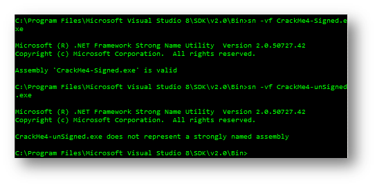 For this, we run it using the following command: sn –vf MyAssembly.exe (or MyAssembly.dll)