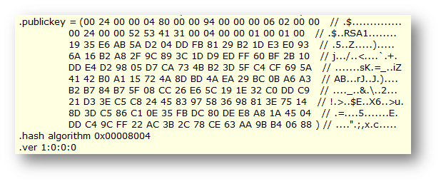 Using the same tool, we can also explore the public key of a signed assembly using the following command: sn –tp MyAssembly.exe (or MyAssembly.dll).