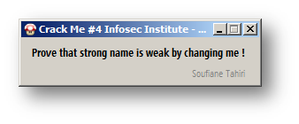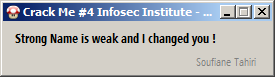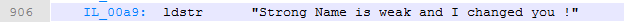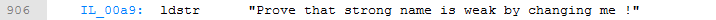 Basically, we need to change the string loaded even if this is a strong name protected assembly. Start by disassembling our target using ILDASM to produce an IL file, which is the attached CrackMe#4 –BreakingStrongName, then search for this string: