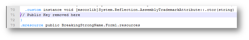 The first way to remove a strong name from an assembly is by simply removing these directives and its content which will lead to something simillar to this: