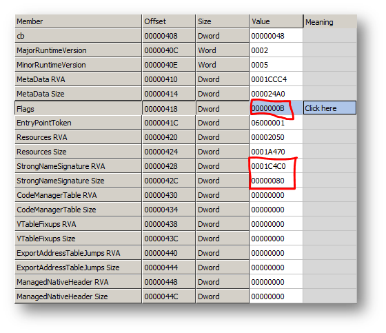 Flags = 0000000B means COMIMAGE_FLAGS_ILONLY (0x00000001) |COMIMAGE_FLAGS_32BITREQUIRED ((0x00000002)| COMIMAGE_FLAGS_STRONGNAMESIGNED (0x00000008). This means that the image file contains IL code only with no embedded native unmanaged code. This image file can only be loaded on a 32-bit processor and is protected with a strong name signature. So 0x00000001 + 0x00000002 + 0x00000008 = 0x00000011, which is B in hexadecimal.