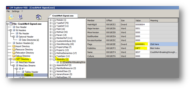 The trick is to change the value of the Flags field by changing COMIMAGE_FLAGS_STRONGNAMESIGNED from 0000000B to 00000003, and changing the StrongNameSignature Size and StrongNameSignature RVA to 0. But this is not everything. Keep on analyzing the target using CFF Explorer by clicking on Metadata Streams -> Tables -> Assembly: