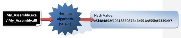 Hashing is essentially used to verify data integrity so that we can determine if the message (data) was altered or not. Hashing is an algorithm capable of producing another data with smaller and/or fixed length. In our context, data refers to an assembly, so our assembly is used as an input for an algorithm hash, such as SHA-1 (as it happens on strong naming) or MD5 to produce a "theoretically?" unique output.