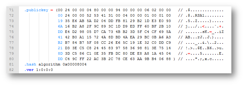 If the assembly we are analyzing was not strongly named, the .publickey directive should be missing. Obviously, any other tool like Reflector and ILSpy will do the same work.