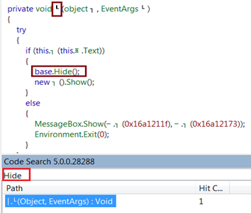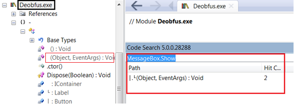 After selecting Deobfus.exe from the left pane, type the MessageBox.Show or MessageBox in CodeSearch and hit enter. It is yielding a single result which points out the method in the left pane, where the implementation is specified as follows: