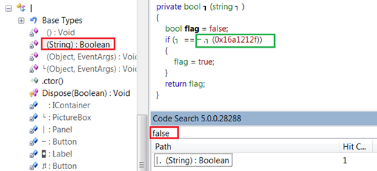 So these code segments contain everything that we are looking for. But there is one more thing we could search to ease reverse engineering. Here, the If condition block is evaluating on behalf of a Boolean value, so it might contain a method definition. However, we have to perform one more search in order to identify that method where actual password authentication code would reside. Hence, search true or false string via CodeSearch again. Bingo!!! It produces the exact method code specification as follows: