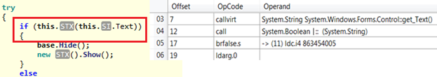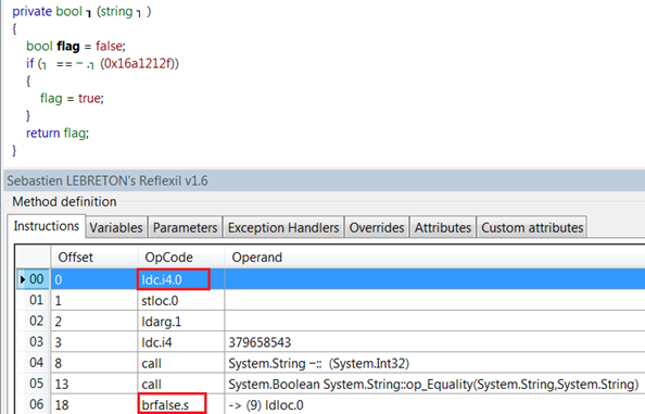 Looking through the code and CIL, we see an interesting instruction at offset 0 as idc.i4.0, which is actually setting the flag value to false. In the next instruction set, the passed argument is compared with a predefined value (which is the password but in hash form), and finally this method returns a Boolean value.