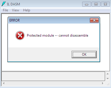 Great!! This software is built and compiled under .NET CLR framework. It is rather easy to decompile .NET assembly by using a couple disassemblers such as ILSPY, Reflector and ILDASM, because such tools are competent enough to decompile the .NET binary into actual source code. As we stated in earlier articles, ILDASM can decompile IL assembly code of an executable, moreover it is possible to recompile that modified IL code with different name using ILASM.exe; however we tried ILDASM here, but it could not save us because IL code is also fool-proof protected, and ILDASM can't decompile it as follows: