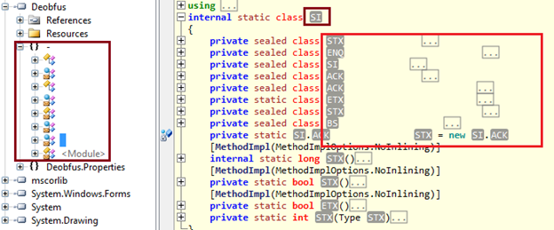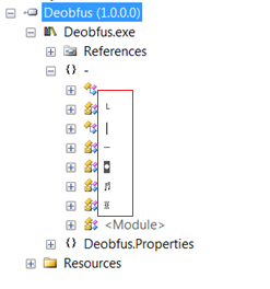 Let's come again over encrypted disassembled code in the reflector. It is showing as members of this assembly in inexplicable symbols forms. As a rule of thumb, just only concentrate over the Pink Brick icons in the reflector, because they contain the real code. The remaining is worthless for reverse engineering as follows: