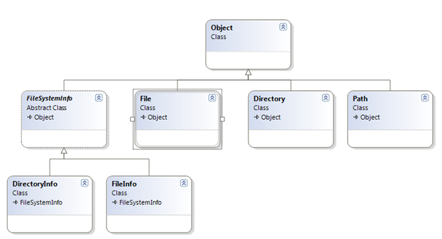 The System.IO provides four classes that allow you to manipulate individual files and interact with a machine directory structure. The Directory and File directly extends the System.Object to allow creating, copying, moving, and deleting using various static methods only, never instantiated. The FileInfo and DirectoryInfo types are derived from the abstract class FileSystemInfo type and they are typically, employed for obtaining full details of a file or directory because their members tend strongly to return type objects. They implement roughly the same public methods as Directory and File, but they are stateful and the members of these classes are not static.