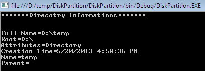 The DirectoryInfo class contains a set of members used for creation, deletion, moving, and enumeration over directories and subdirectories. The following code sample displays the information related to the temp directory in D drive: