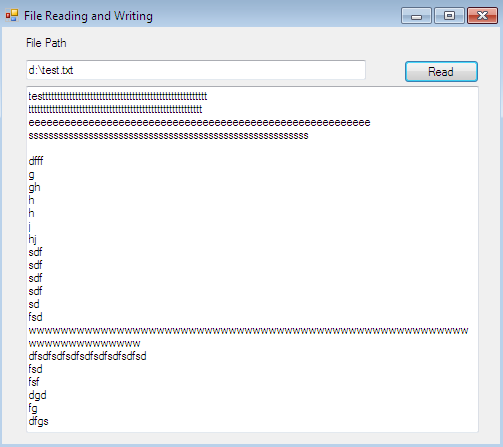 It takes a path to save the file and a content input method medium, such as a text box or any other control. The following image depicts a text file reading by entering its corresponding path: