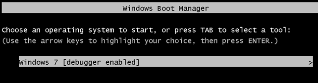 After restarting Windows, the boot menu when starting Windows will look like this; notice the added "[debugger enabled]" string, which indicates that we'll start Windows under the previously entered debugging commands.