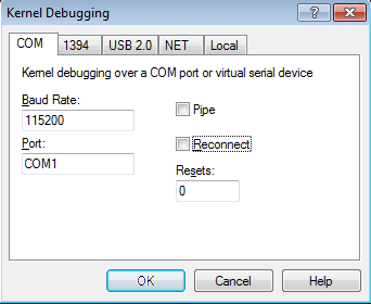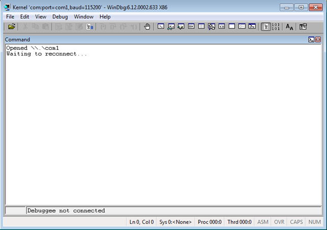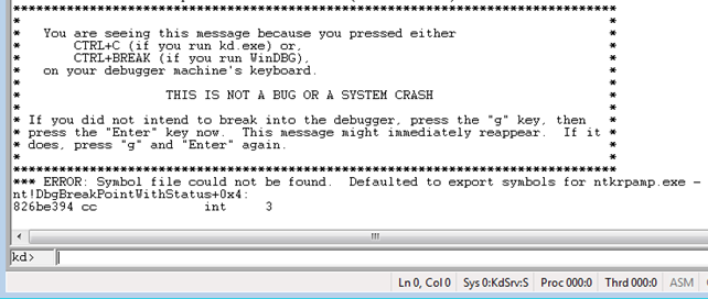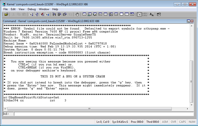 To start kernel debugging, we need to press the File – Kernel Debug in Windbg (in the first VM of course), and set the baudrate/port (the defaults are fine in our case). After pressing OK, the WinDbg will be waiting for the debuggee to connect. To make that happen, we need to start the second VM, which will connect to the serial port and our WinDbg (in first VM) will be able to catch it. When that happens, we can break the execution of the Windows operating system, which will enable us to enter commands at the "kd>" prompt.