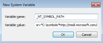 On the picture above we can notice that the symbol file was not found. Whenever using WinDbg for debugging I always set the _NT_SYMBOL_PATH environment variable to the "srv*C:symbols*http://msdl.microsoft.com/download/symbols" value as seen below.