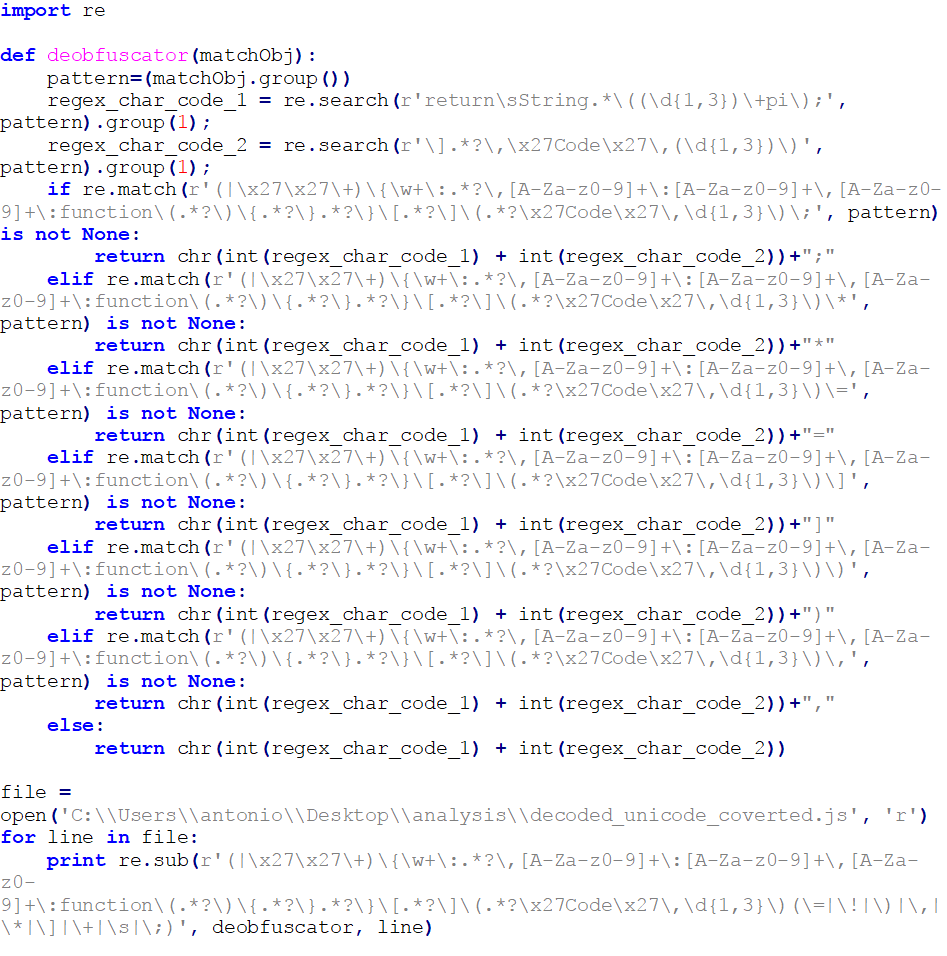 For the deobfuscator script implementation, you can choose any scripting language that can support regex, in this case, I used Python.