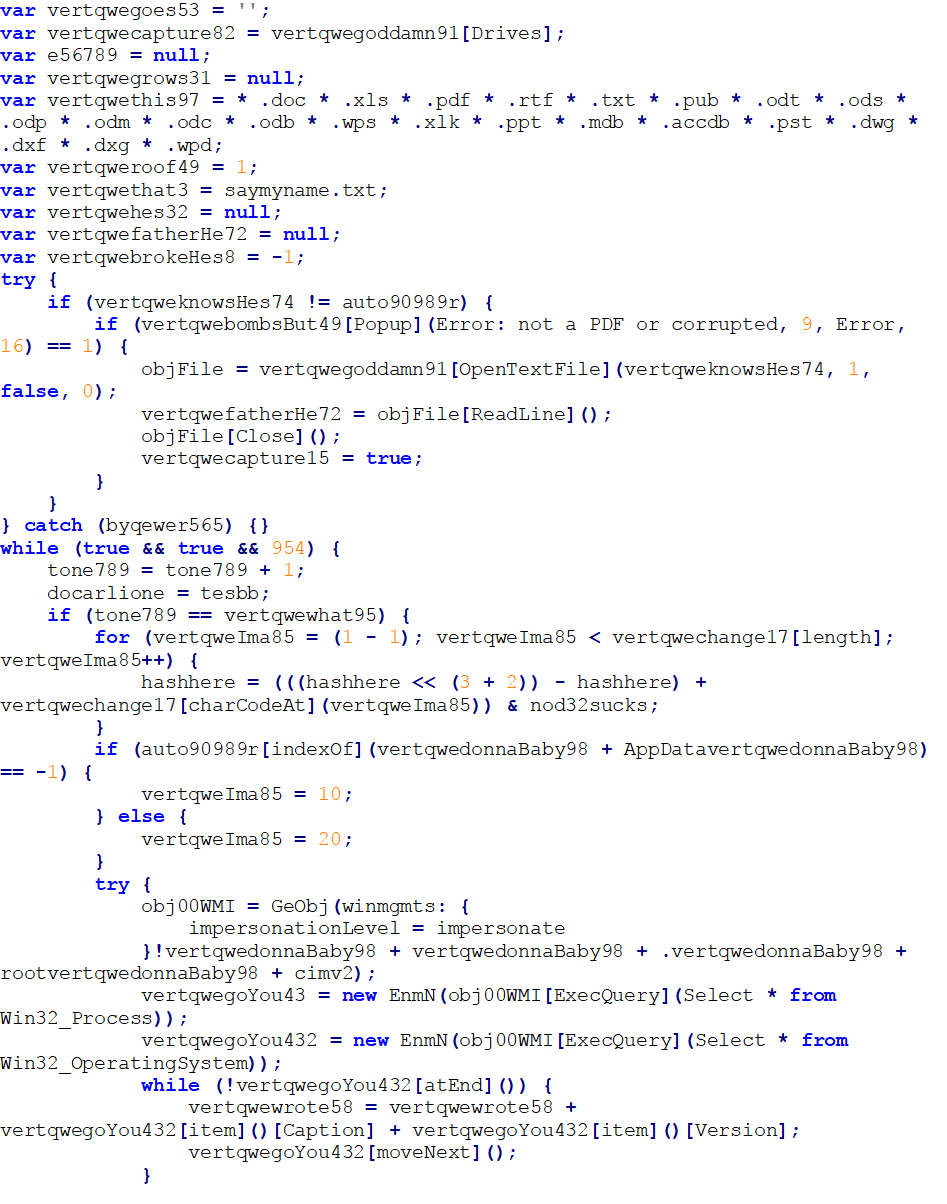 Opening the .jse dropper, I quickly recognized that it is encoded with the JScript.Encode function provided by Microsoft, following the example code: