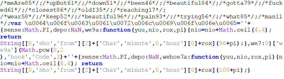 To figure out what is the obfuscation technique used in the dropper, I need to beautify the code through some online beautifier [3], because the original dropper contains half a million characters on a single line, following a small piece of code as a result: