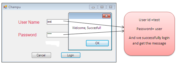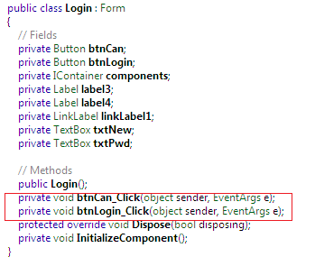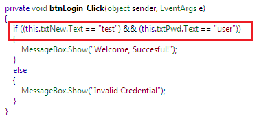 By expanding the btnLogin_Click() method event, we can notice that user name and password validation is not performing from a database, and they are not in encrypted form. Rather, they are hard-codes as "test" and "user" as follows: