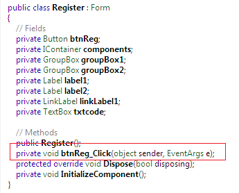 Up 'til now, we successfully extracted the functioning of registered and unregistered users. Furthermore, we can determine that the Register class is responsible for License code manipulation where the btnReg_Click() method event is the key hack to execute such implementation as follows: