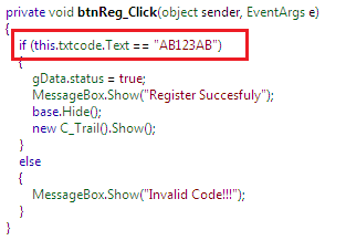 If we expand this btnReg_Click() method, the whole picture becomes clear. This software doesn't do any complex operation in order to manipulate the key codes. It is basically hard-coding the license key as AB123AB as follows: