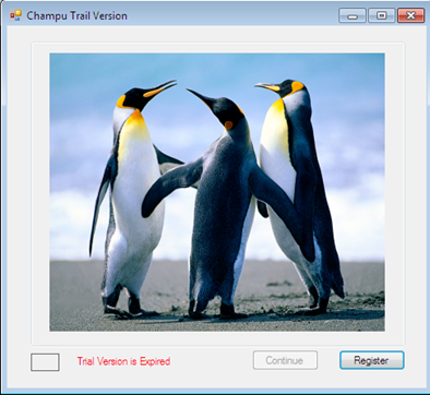 It's called "Champu," named after my son's pet. The program can be launched when a vendor initiates a test, and works for a fifteen day period. After the fifteen day period, it expires automatically. That's the first security feature it has. Other security features include a form to authenticate usernames and passwords, and a license key code, due to piracy. The initial trial version window looks like this: