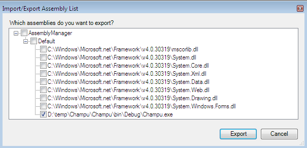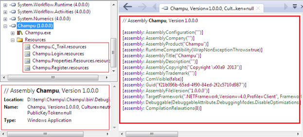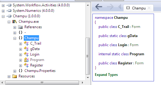 Optionally, can add or remove other .NET native assemblies such as system System in Reflector. Now, just expand Champu from the left pane, and you can find the namespace definition referred to as Champu in the source code. Just select it and it will wrap-up everything in the right pane.