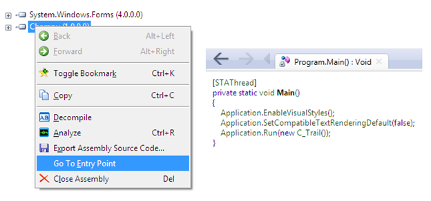 The assembly could contain numerous classes and they all contain two different types of logic. So, it's very complicated to figure out where we start tracing. We have to identify the entry point of the executable. That's why you should right click on champu.exe to provide Reflector with an entry point option. In the right pane, the Main() function of the assembly is displayed, and C_Trail class loads.