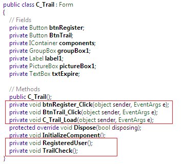 Up until now, we've discovered that the entry point C_Trail class which is where the trial duration logic is implemented. Select that class from left pane after expanding the Champu namespace. The class will give us an overview to the control integrated in the trial class user interface. It contains two methods, RegisteredUser() and TrailCheck().