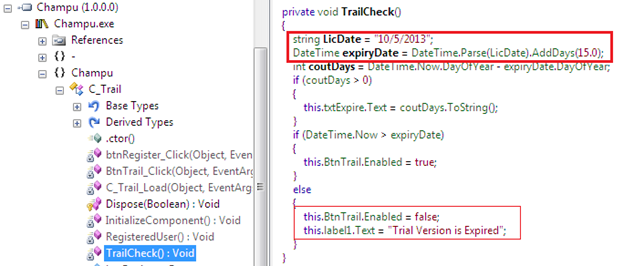 Go to the TailCheck() method body by selecting it. We'll find the entire trial duration logic source, as we would in Visual Studio 2010. We can figure out that the program will work for fifteen days from 10/5/2013. In addition, we can find the trial expiration message in the source code.