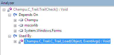 Here's the source code of the TrailCheck() method. We're not sure about the calling or triggering condition of the method. Just select the TrailCheck() method from the left pane and click on the analyze option. It'll display some useful information such what is using the method (the triggering condition is On_Load()) and what its dependencies are.