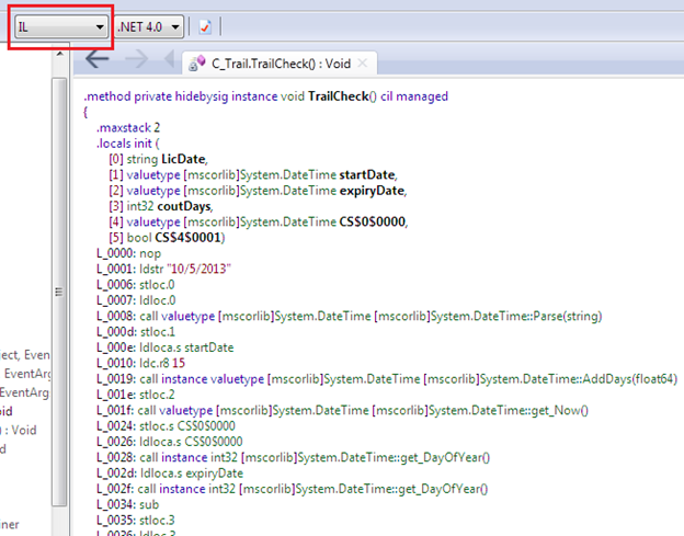 If you'd like to see the MSIL opcode instructions behind the source code, we can change it into its corresponding IL code. We don't need to use the ILDASM tool.