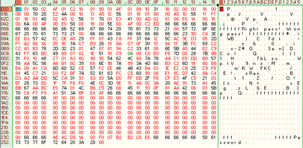 Fair enough! Therefore, our goal is to find the right password to make the program output the right password message. Before looking at the binary let's start by examining the opcodes file (vm_file) using a hex editor: