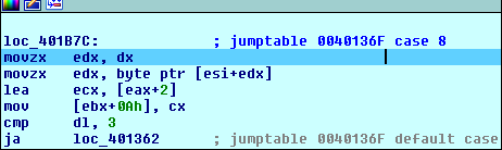 So basically we are now at "case 0x18 :" since the compiler chose to do some optimization and add a subtract operation. Now if you go back and check the Hex visualization of the vm_file you'll notice that the very first byte is 0x18. This opcode seems to need some operands that's why the VM will read one more bytes using the DX register. Next the VM's instruction pointer at [EBX+0Ah] is updated to EAX+2, this basically means that IP has moved to the next byte. After that, the read byte is compared to 3 and if it's above it then the program leaves the loop, you can see it as an exception to the VM. In our example, we're safe from that check since the second byte in the file is equal to 0x1. Thus, we won't take the jump and we'll land here: