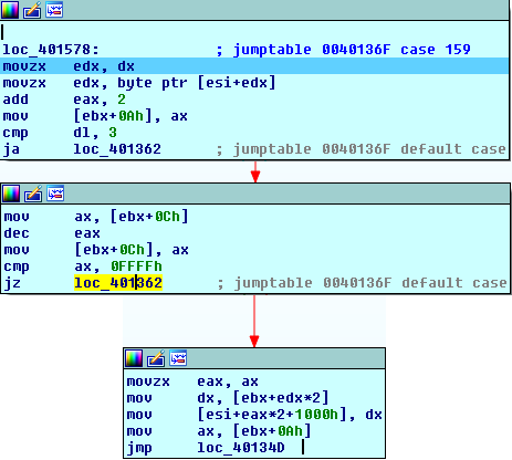 Back to our routine we notice that the register is decremented and then checked against 0xFFFF. Since it was initialized to 256, this register won't take 0xFFFF until its value before decrementing is 0. If it's indeed the case then the VM exits the loop. However, since it's our first time executing this routine we are sure that [EBX+0Ch] is equal to 255.