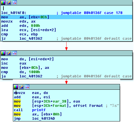 This opcodes seems to access the stack and read its top WORD, but before doing so, it checks whether the stack is empty. If it is indeed empty, it gets out of the VM loop (exception). Since a value has been already pushed, we know that the stack isn't empty! After the WORD has been read in DX, the stack pointer is incremented. We know that the value of DX is 0x250 and it's part of the section containing code and data. Therefore, the "address" (offset) doesn't have to exceed 0x1000 or the VM would be reading/writing into the stack space. The next thing that is done is the use of ESI+DX as a string pointer, the string is subsequently printed using printf. In our example, the string stored at offset 0x250 in the vm_file is: "Password :" and that's what printf will show on the screen.