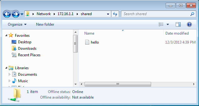 By declaring the share as guest only, we've effectively given access to any user connecting to it without entering a password. If we connect to the share now, it would present us with a shared folder without entering for username and password. On the picture below we can see the contents of the shared folder, which contains only the hello.txt text file.