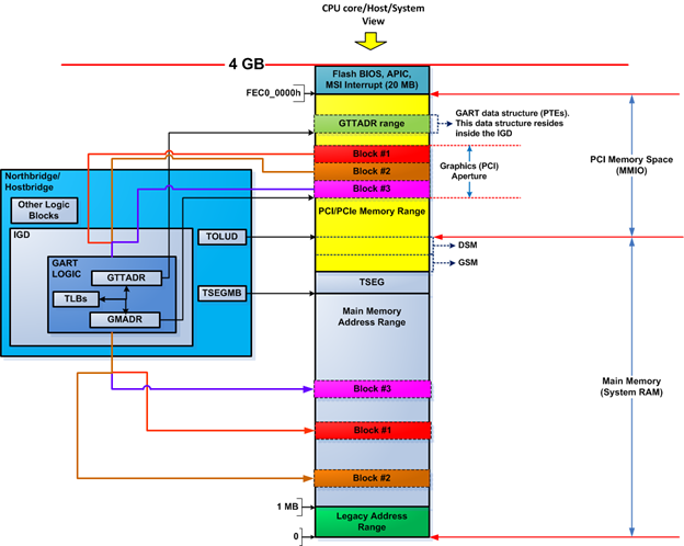 - Block #1, Block #2, Block #3. These blocks illustrate mapping of adjacent memory blocks from the graphics aperture range to the system DRAM memory range. They illustrate the presence of linear memory space in the graphics aperture range, which is translated by the GART logic into memory blocks allocated by the OS in the system DRAM. If you are still confused about how this mapping works out, read the GART section in the first article.
