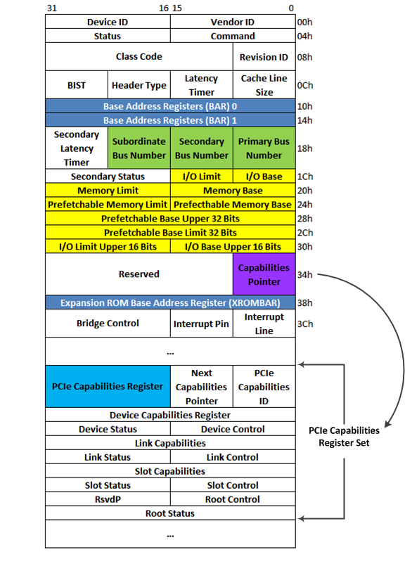 The numbers in the top of Figure 2 mark the bit position in the registers of the PCI configuration space header. The numbers to the right of Figure 2 mark the offset of the registers in the PCI configuration space header. Registers marked with yellow in Figure 2 determine the memory and IO range forwarded by the PCI-to-PCI bridge from its primary interface (the interface closer to the CPU) to its secondary interface (the interface farther away from the CPU). Registers marked with green in Figure 2 determine the PCI bus number of the bus in the PCI-to-PCI bridge primary interface (Primary Bus Number), the PCI bus number of the PCI bus in its secondary interface (Secondary Bus Number) and the highest PCI bus number downstream of the PCI-to-PCI bridge (Subordinate Bus Number).