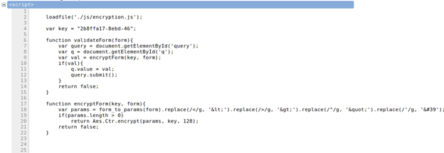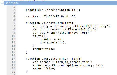 The "val" variable calls another function encrytpForm() using as parameters the encryption key "key" and the form elements which we entered in the search form.