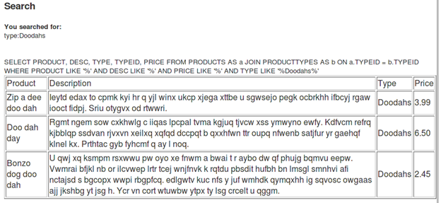 [sql]SELECT PRODUCT, DESC, TYPE, TYPEID, PRICE FROM PRODUCTS AS a JOIN PRODUCTTYPES AS b ON a.TYPEID = b.TYPEID WHERE PRODUCT LIKE '%' AND DESC LIKE '%' AND PRICE LIKE '%' AND TYPE LIKE '%Doodahs%'[/sql]
